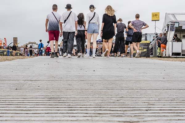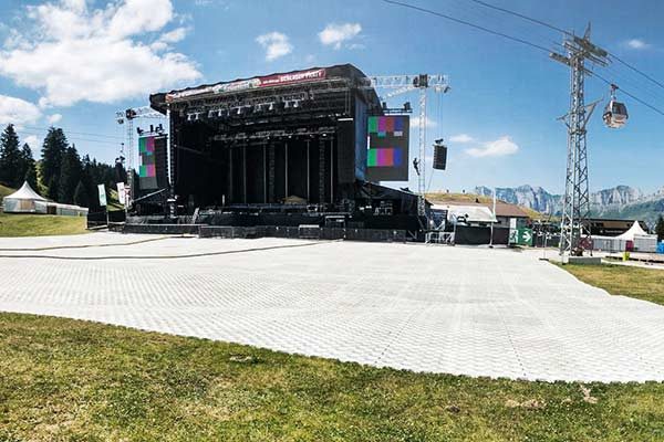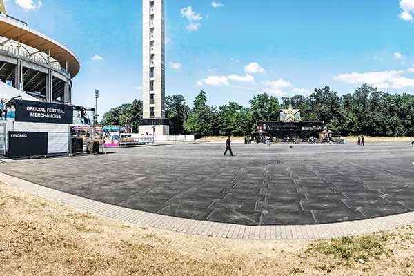 Eventboden outdoor: Finden Festivals unter freiem Himmel statt, muss am Boden alles stimmen. Denn Bühnen und andere schwere Aufbauten sowie viele Besucher verlangen dem Untergrund einiges ab. Tragfähigkeit, Ebenheit und Rutschfestigkeit sind wesentliche Eigenschaften, die Open-Air-Gelände auszeichnen sollten. Doch Weide-, Ackerland oder ähnliche Böden geben zum Beispiel bei starker Belastung nach oder entwickeln sich bei Regenwetter zur reinsten Rutschpartie.