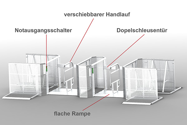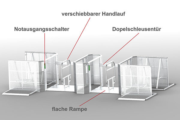 Als Vereinzelungsanlage verfügt das Tor über zwei 57 Zentimeter breite Durchgänge. In seiner Funktion als Notausgang öffnet es sich auf eine Breite von 1,20 Meter, was den aktuellen Vorschriften entspricht. Die Transformation zum Notausgang erfordert einen einzigen Knopfdruck.