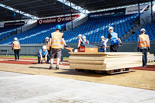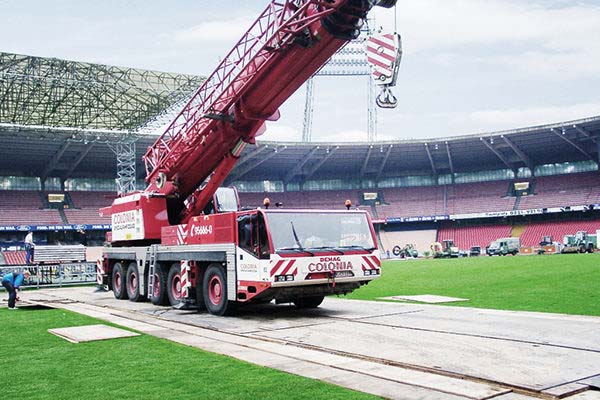 Für weiche Böden empfehlen wir reißfestes Geotextil. Diese Vliesstoffunterlage ist auch für größere Belastungen geeignet. Für härtere Böden und geringe Belastungen stellen wir PE-Folie zur Verfügung. Bei extremen Belastungen, wie zum Beispiel bei einem Kraneinsatz auf der empfindlichen Rasenfläche eines Fußballfeldes, müssen die drei- bis vierlagig verlegten Platten gegebenenfalls noch zusätzlich durch Stahlplatten, Holzbohlen oder beide Ergänzungen stabilisiert werden. So bietet Plywood Untergründen besten Schutz und sorgt für eine optimale Lastverteilung.