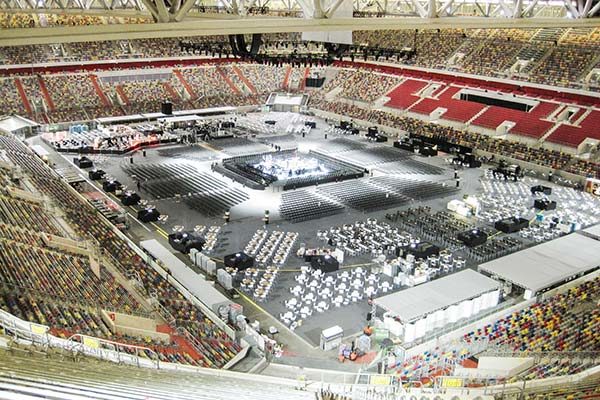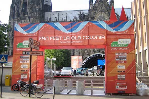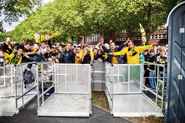 Outdoor venues present different challenges than indoor venues. Sometimes tents, containers, or other space systems, such as lodges, are necessary. These are ideal when it comes to camping in the context of sports festivals. Moreover, we provide sufficient sanitary facilities everywhere. Similarly, we keep site material, such as mobile lighting, production vehicles, and cable protection bridges, and banners and flags ready.
