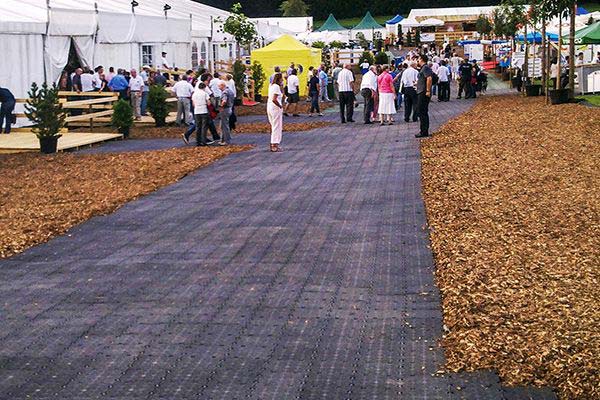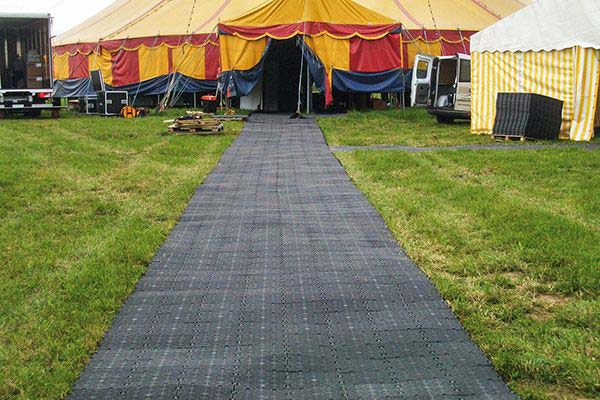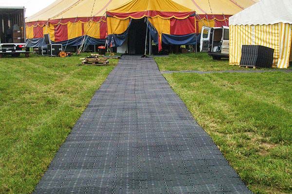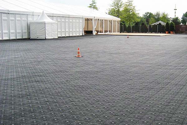 Conical drainage openings make the system permeable to light, air, and water, providing optimum protection for the covered green area. This way, the lawn receives enough oxygen and sunlight to maintain healthy green grass. Additionally, the unique sub-surface structure prevents the panels from digging into the covered soil. We are happy to take care of transport, construction, breakdown, and final cleaning upon request.