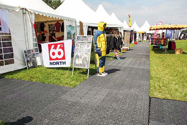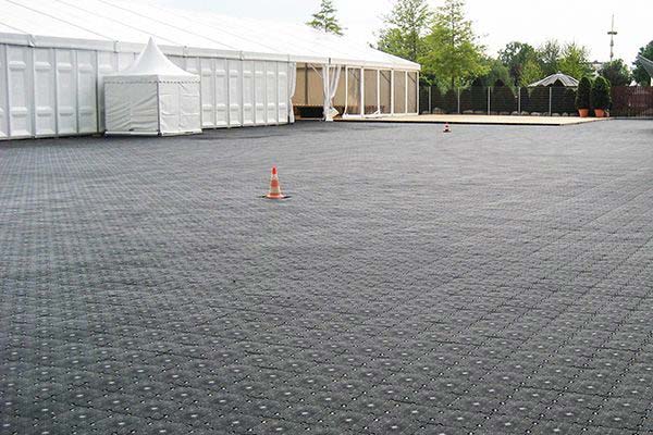 The pedestrian event flooring is 2.20 centimeters high (1 inch) and pyramid-shaped, creating a non-slip and safe surface for event visitors. The turf protection mats are available in black, white, red, green, blue, and many other colors. All versions are made of polyethylene, with the black version made of recycled plastic.