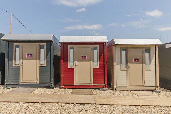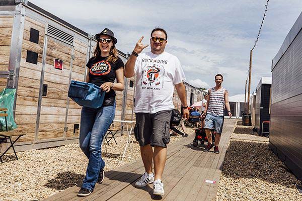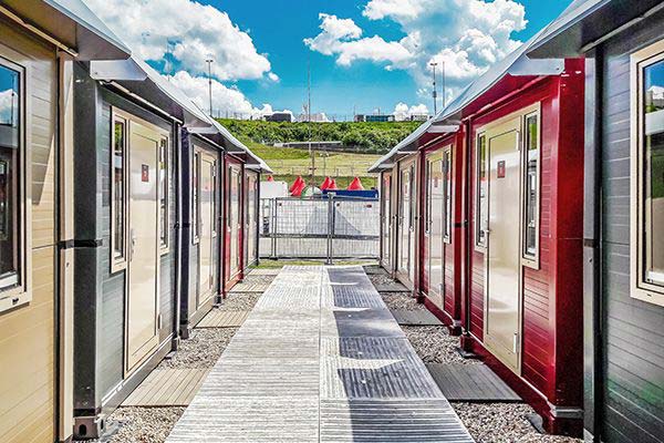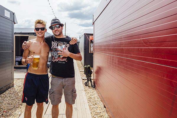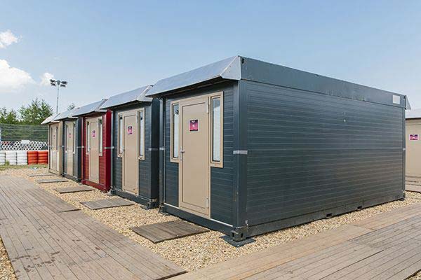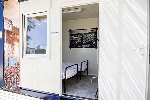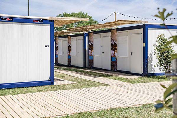 To enhance security, we offer special anti-theft devices. For added comfort, we provide parasols or sun sails for shading on the terrace and darkening curtains or Venetian blinds for privacy and a good night’s sleep. Additionally, our containers can be customized with room numbering and the option to use container walls as advertising space, providing tailored solutions for VIP camping next to the concert stage or for special trade fairs.