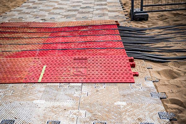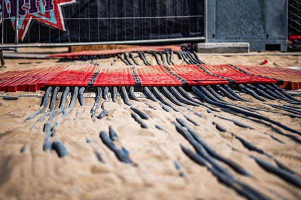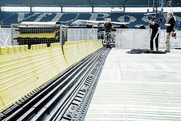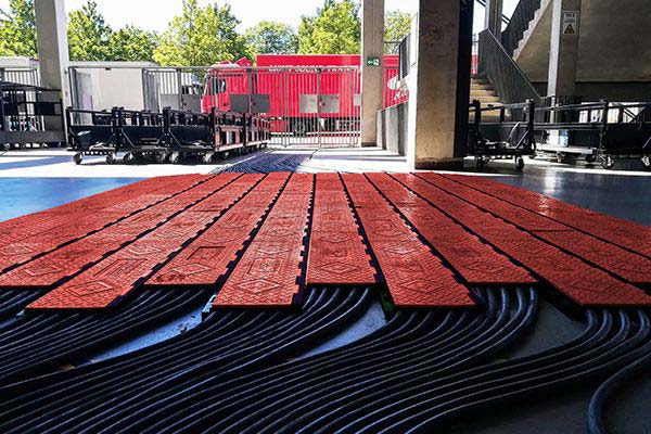 We offer several cable protection systems made of resistant polyurethane channels of different sizes and numbers. These robust, weather-resistant systems have a modular design principle and are ideal for numerous festivals, concerts, film, and TV productions, and construction sites, and can withstand different levels of exposure. Profiled and non-slip surfaces ensure optimum stability. Our systems’ hinged covers are a unique feature that sets them apart from other solutions, eliminating the need for separate cover installation and minimizing the risk of loss.