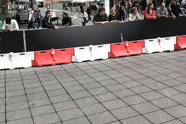 The white and red plastic elements of the Water-filled Traffic Barriers are each 1.25 meters long (49.2 inches), 35 centimeters wide (13.80 inches), and 50 centimeters high (19.70 inches). With a weight of 7.50 kilograms (17 pounds), they are easy and quick to transport.
