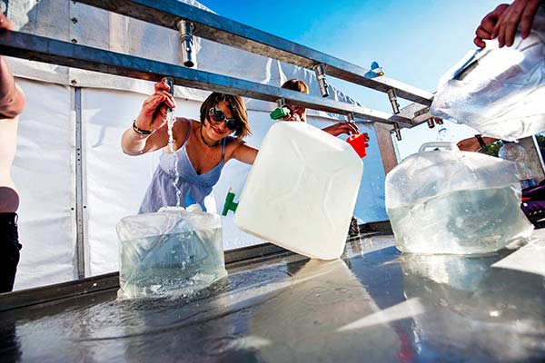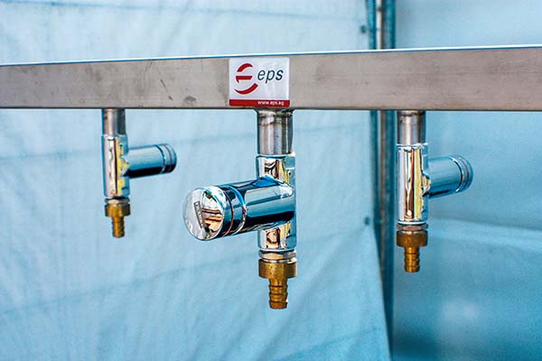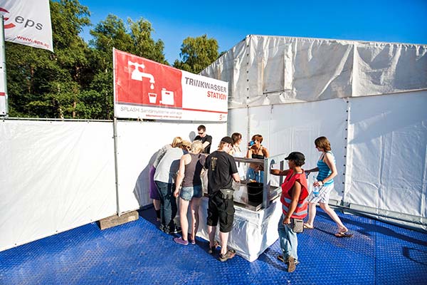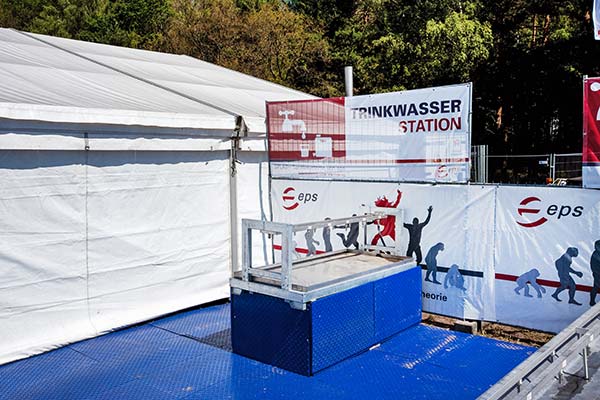 L’acqua viene fornita con raccordi GEKA-plus e le connessioni per gli scarichi sono realizzate con tubi ad alta temperatura con un diametro nominale da 100. Disponiamo di serbatoi di fornitura e di raccolta scarichi, accessori ideali per gli eventi su aree senza rete idrica e fogmaria.